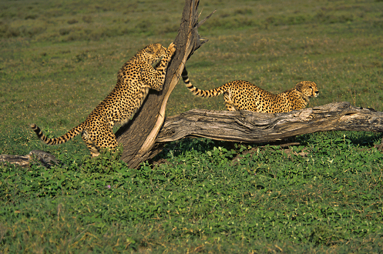 | I am on a jeep safari in Africa. For me it doesn't get any better. The place is Serengeti, the plains of northwest Tanzania. My three fellow photographers and I are accompanied by Doug Cheeseman of California, friend, guide extraordinaire, and world-class expert on Africa. After all, he's been here 58 times. It's his favorite place in the world too, along with everywhere else he's been. We're on the move at daybreak, when the animals are active and the light is magic for us discriminating photographers. We aren't far from our camp at Ndutu when we spot these two cheetah beauties, yawning, stretching, and dozing. Not exactly the stuff of great adventure photography, but the ever optimistic Doug wants to wait. He has a feeling the pair will mate at any minute. So we wait. And we wait. For hours. Nothing! Everyone but Doug is disgruntled. He assures us our patience will be rewarded. We shrug our shoulders and feign submissiveness. After all he is the expert. (next photo) | |