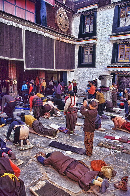 The photograph shows the various stages of "inchworming" in the pilgrim's prostrations, from beginning to end. What it can't portray is the solemnity of mood, the reverence, the nonstop chanting of om mani padme hum, and the smell of incense. Sensory overload! (next photo)