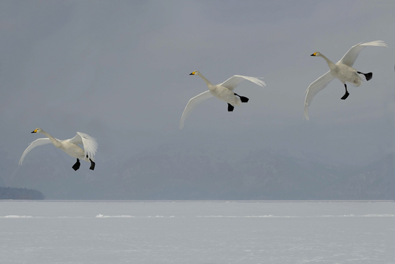 no consequence to a bird, The whooper is a swan of superlatives, the 747 of the avian world. She is the largest and most numerous, and enjoys the widest range of her elegant sorority of sisters which includes the tundra, trumpeter, and black swans. That range stretches across half the northern globe, from Iceland to the Aleutians. By turns elegant in flight, pensive in repose, and raucous in a crowd, this is waterfowl that inspires music, as in Swan Lake. These monarchs of the sky are a stately society with an attitude to boot. It's as if they own the airways and mirrored lakes of the world with their graceful glide and "no splash" landings. A perfect 10 every time. But there's another side to the grace of Swan Lake. Takeoff is anything but elegant. In fact it is laborious if not downright clumsy, the frenetic slapping of webbed feet to water and heavy wings flailing the air, until mercifully there is liftoff. And loveliness doesn't preclude aggressiveness. The comely S curve of her neck can uncoil like a snake at any territorial intrusion. This beak jousting can be bloody, and even deadly. |