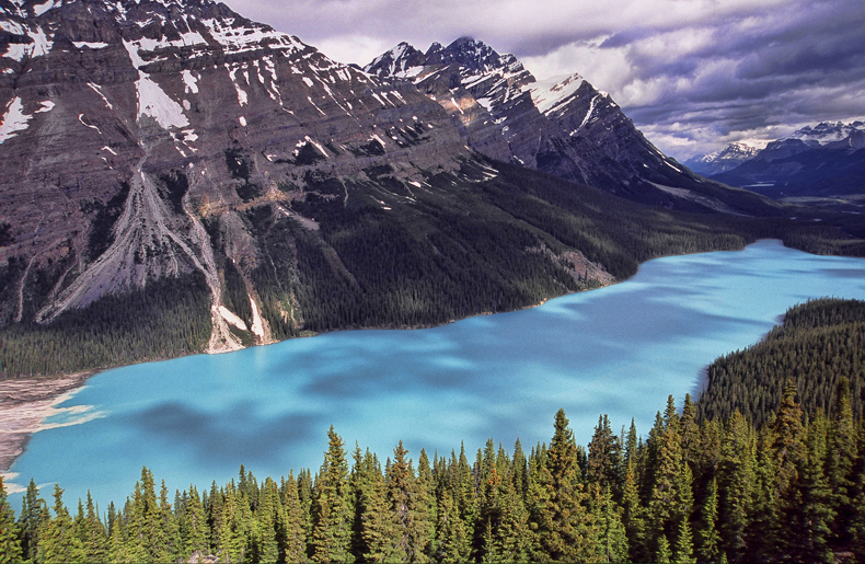 sight has turned inside himself A frigid wind, oblivious to the fact that it is July, tumbles down from the ice above and penetrates several layers of hi-tech clothing. I am chilled and take refuge on the lee side of a small ridge, repose on the flattest rock I can find, and feed on the view. The postcard spread before me is Peyto Lake. From my perch the hand of man is not apparent. This is a primeval landscape, wild, and more than a tad intimidating. I am exploring Canada's Icefield Parkway, 140 miles of roller coaster asphalt, an artery to mind-blowing scenery, perhaps the most picture perfect anywhere. This is the soul of the Canadian Rockies, a white-capped ocean of stone that straddles the Great Divide. Here are icefields, glaciers, psychedelic blue lakes, and wildlife. Even the griz, poster child of the wild, is out there somewhere. (next photo) |